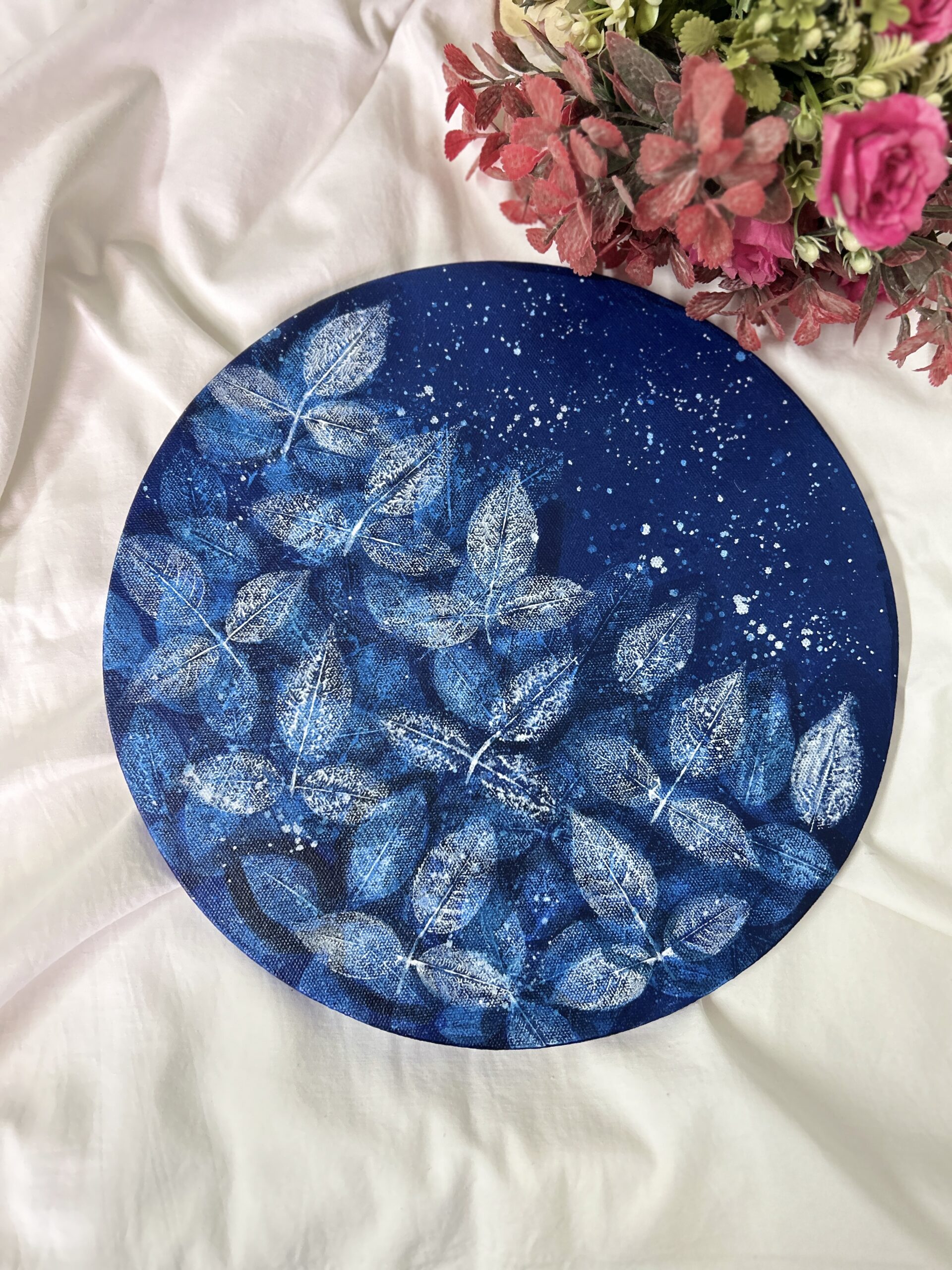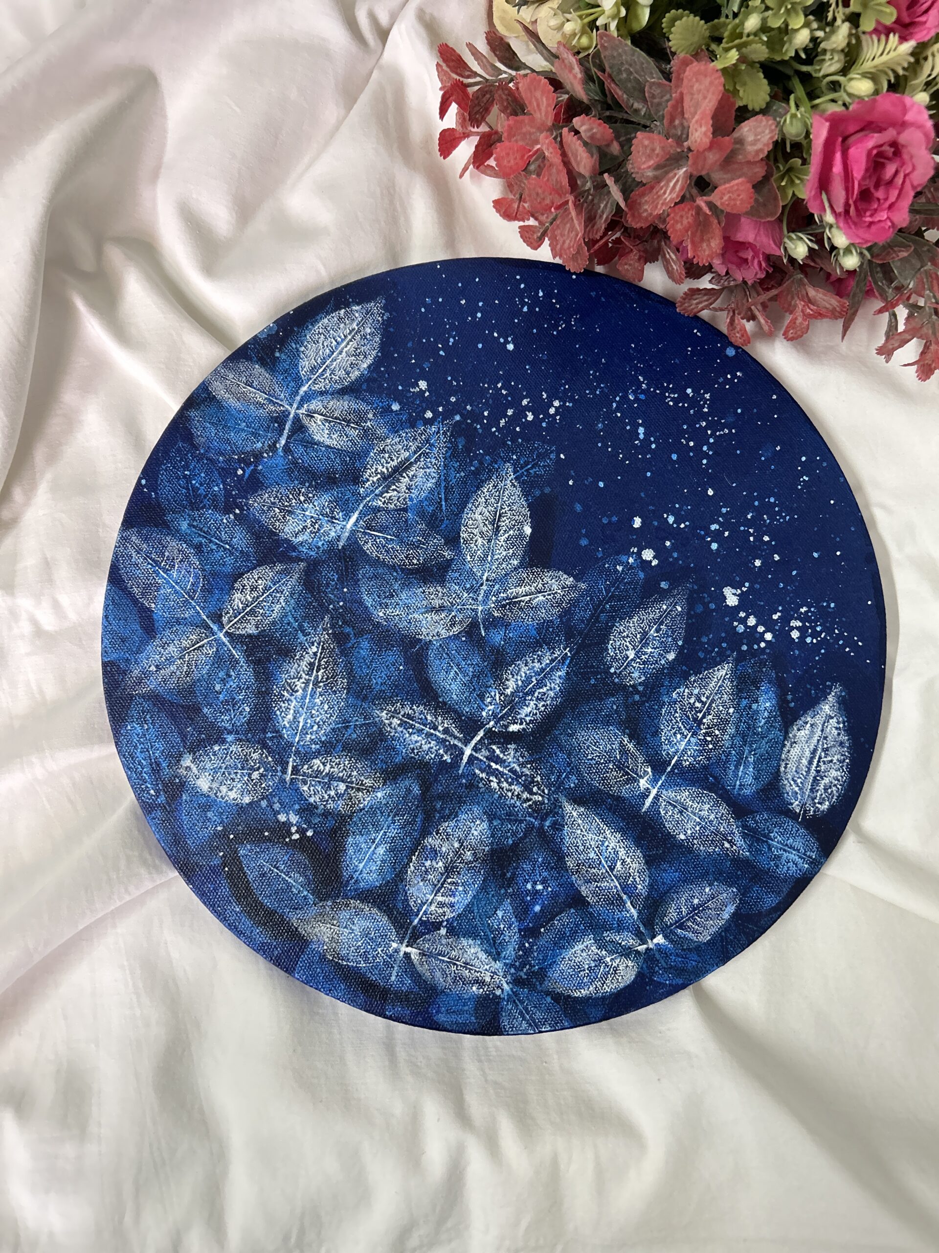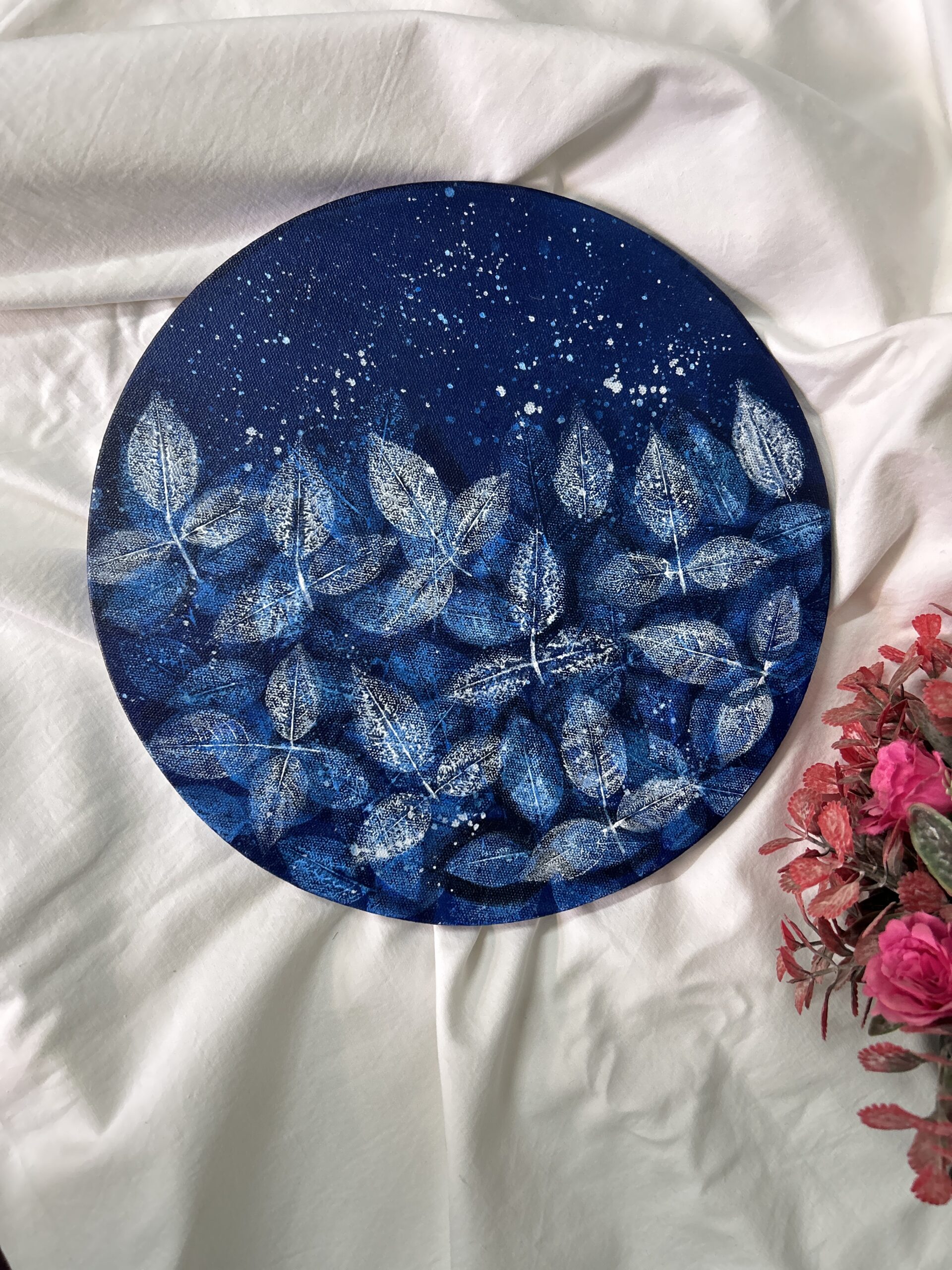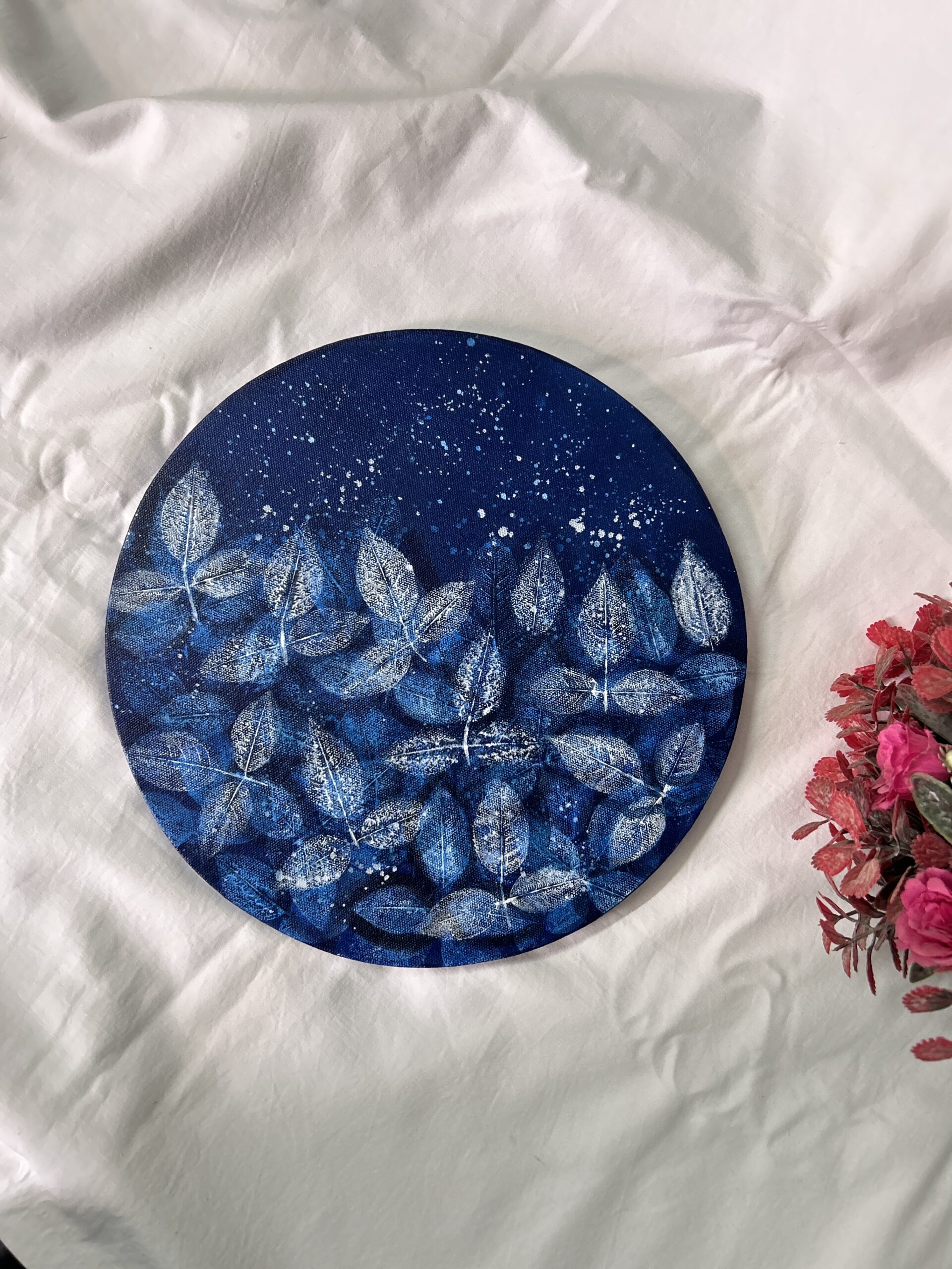 Layers of rich blue tones form the base, while hand-imprinted leaves create a rhythmic, organic composition across the canvas. Subtle splatter details add movement and contrast, giving the piece a calm yet expressive character. The circular canvas enhances the flow of the design, making it a striking visual element for modern and artistic interiors.