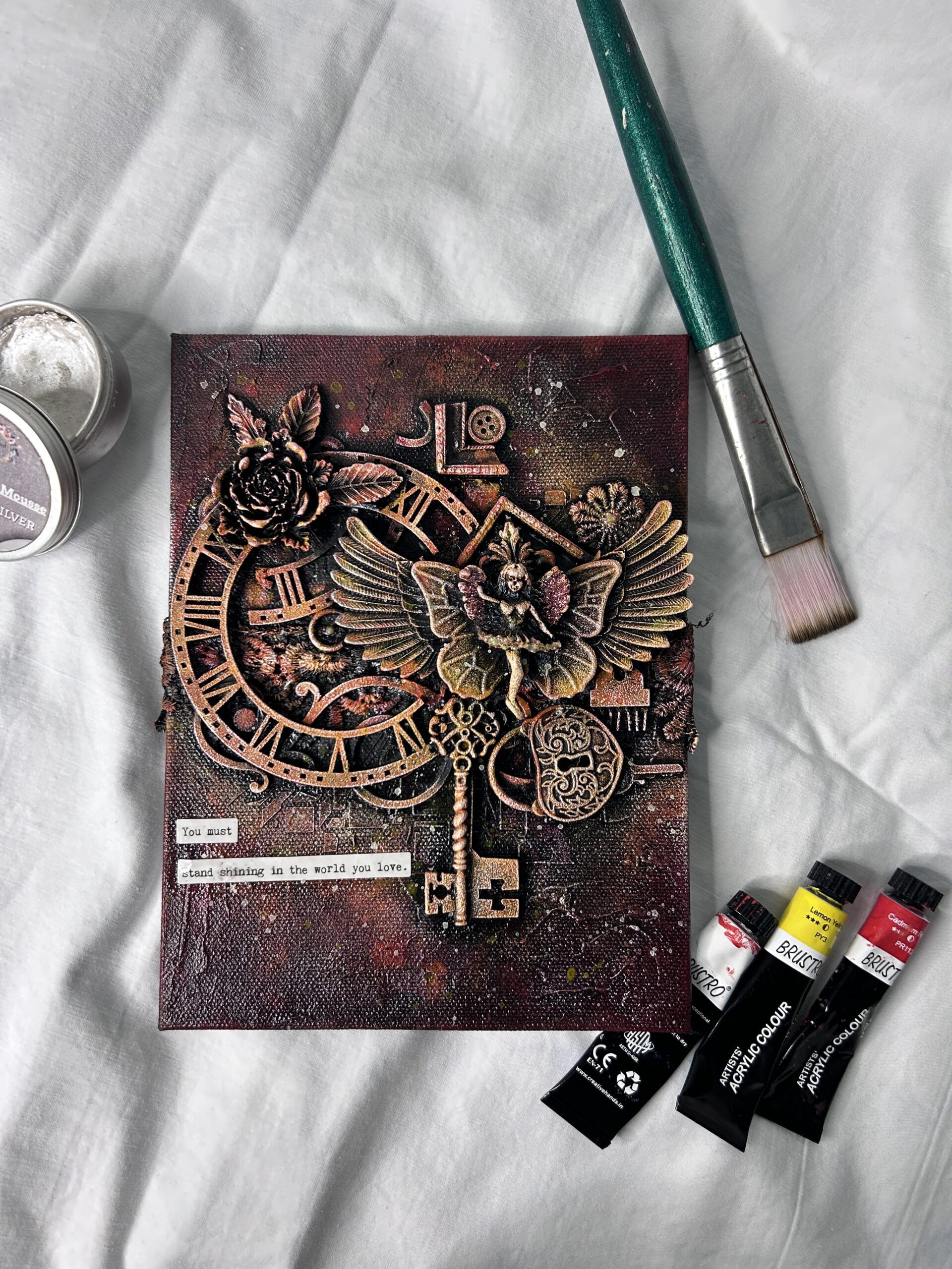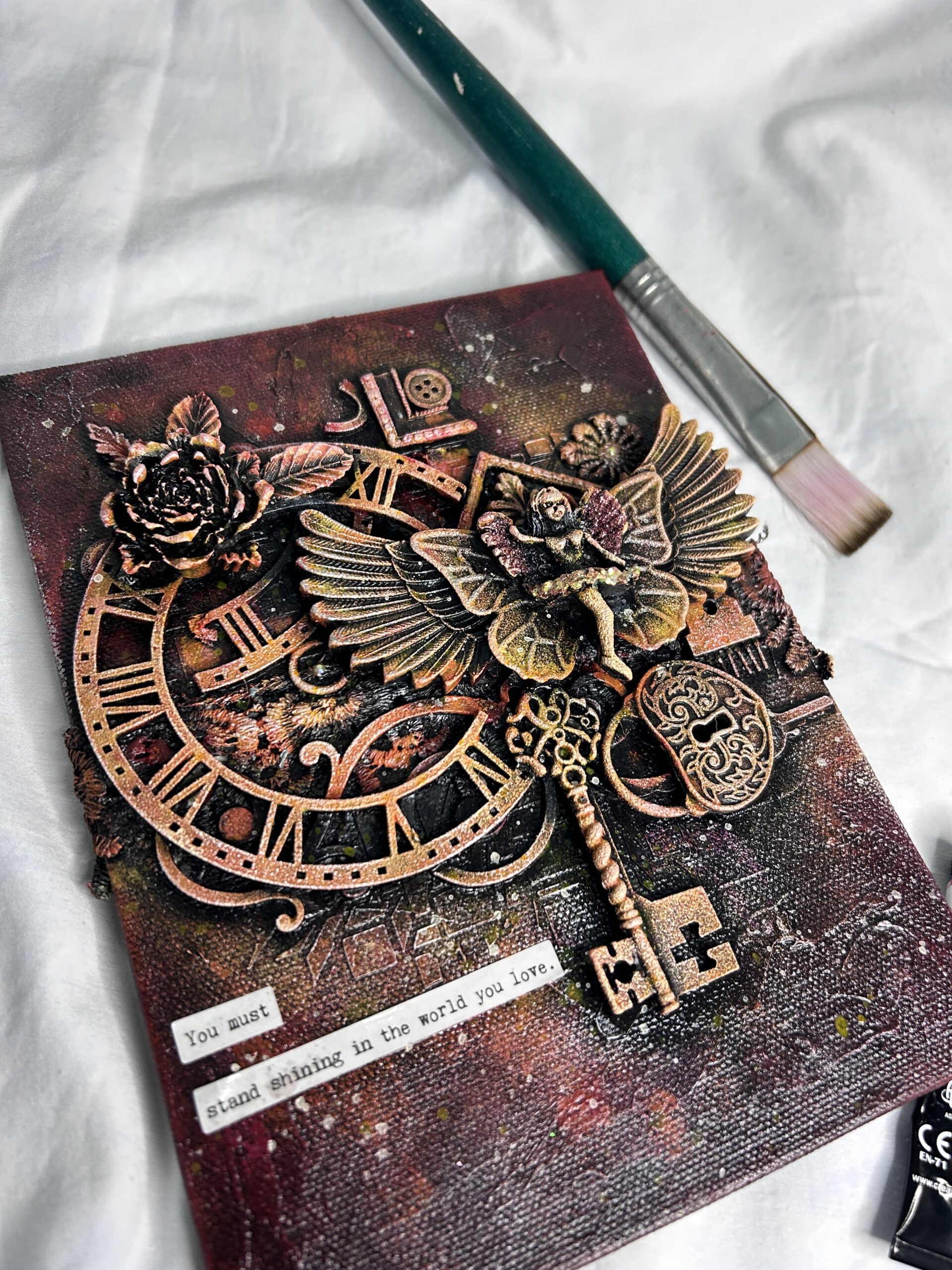 The composition features an angelic figure surrounded by symbolic elements such as a clock face, key, florals, and abstract textures — representing purpose, protection, and the journey of life. The use of mixed materials adds depth and character, making the artwork visually striking and tactile.