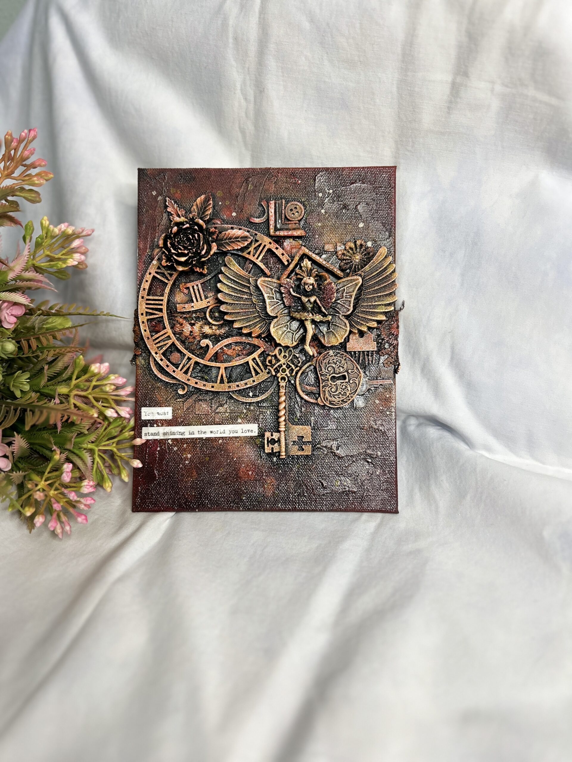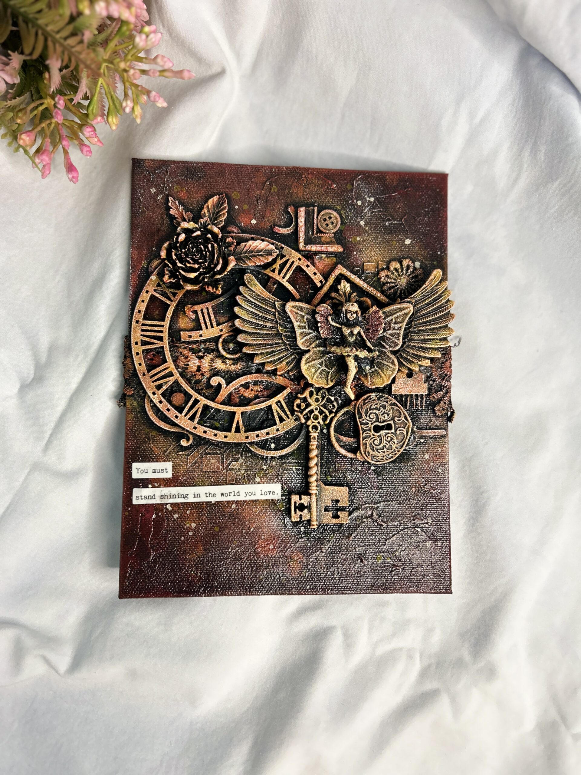 Angel is a powerful mixed media artwork created on a canvas board, combining layered textures, dimensional elements, and rich earthy tones to tell a story of strength, time, and inner light.