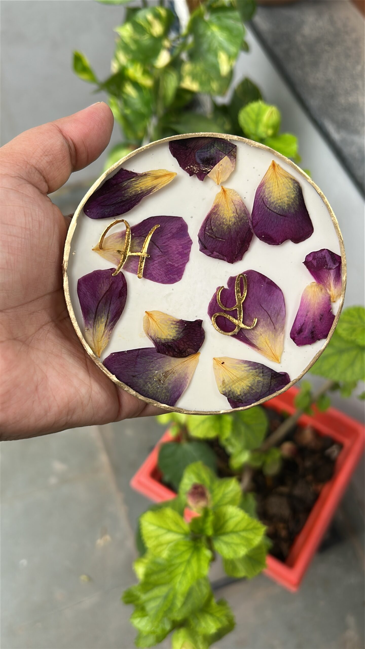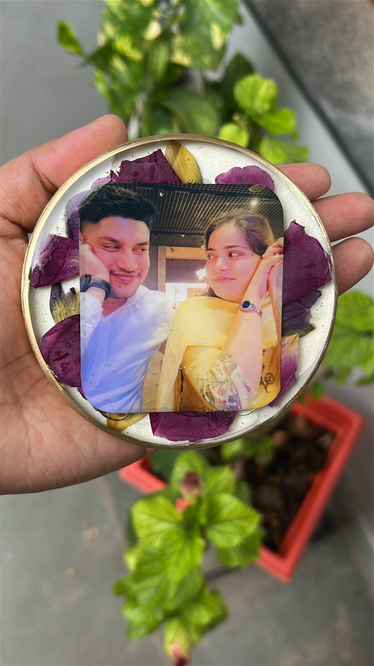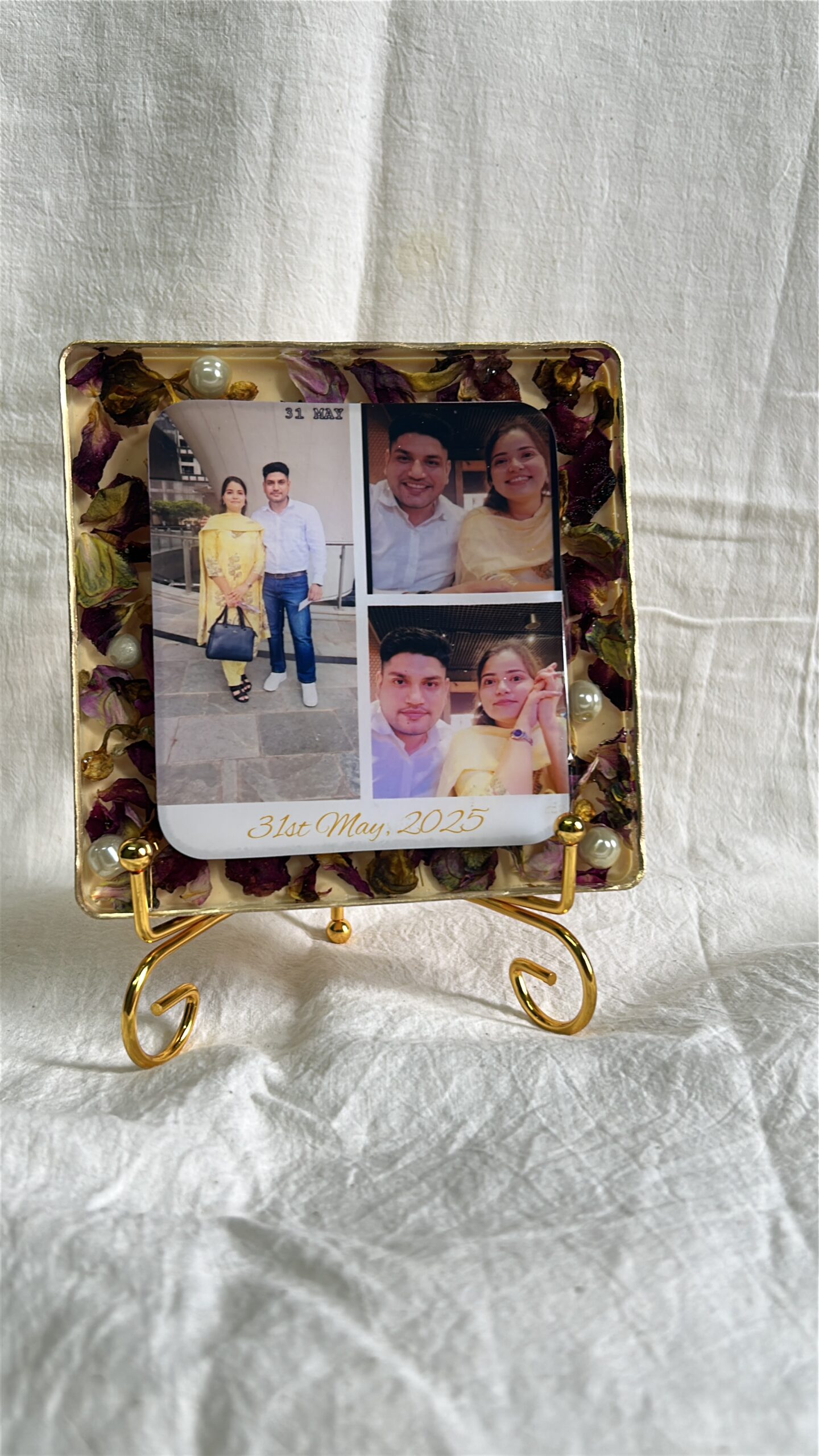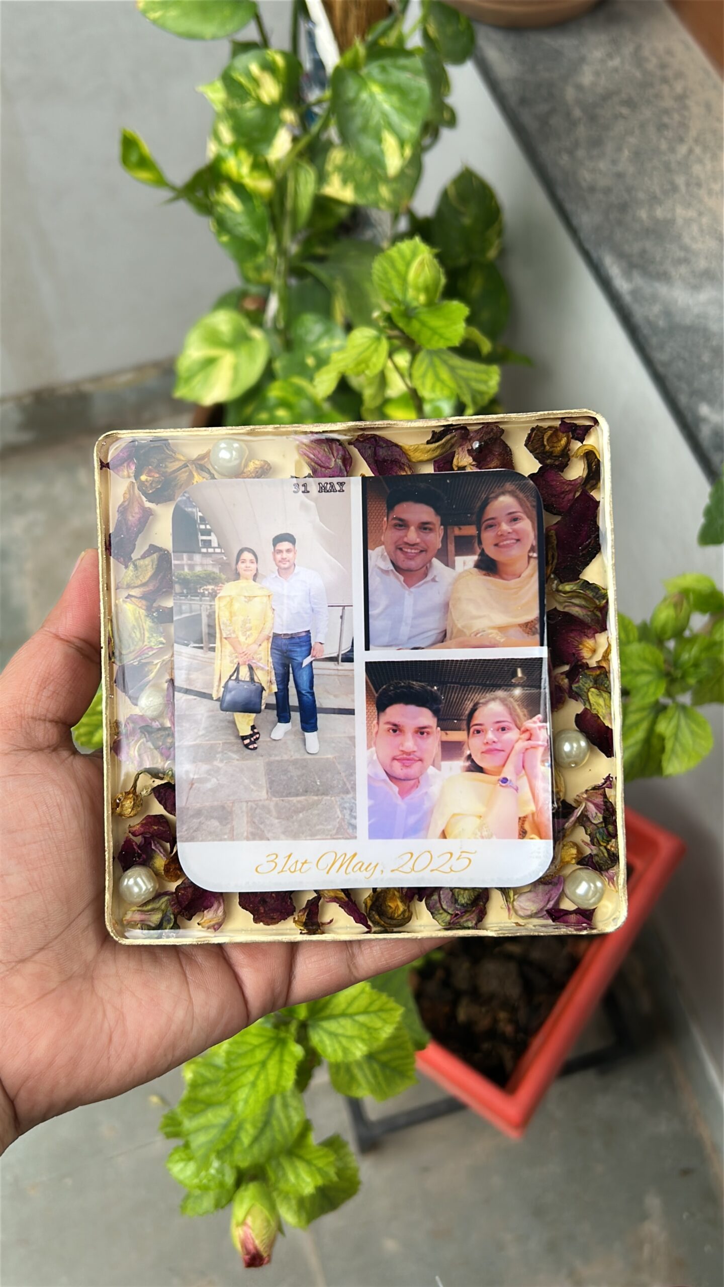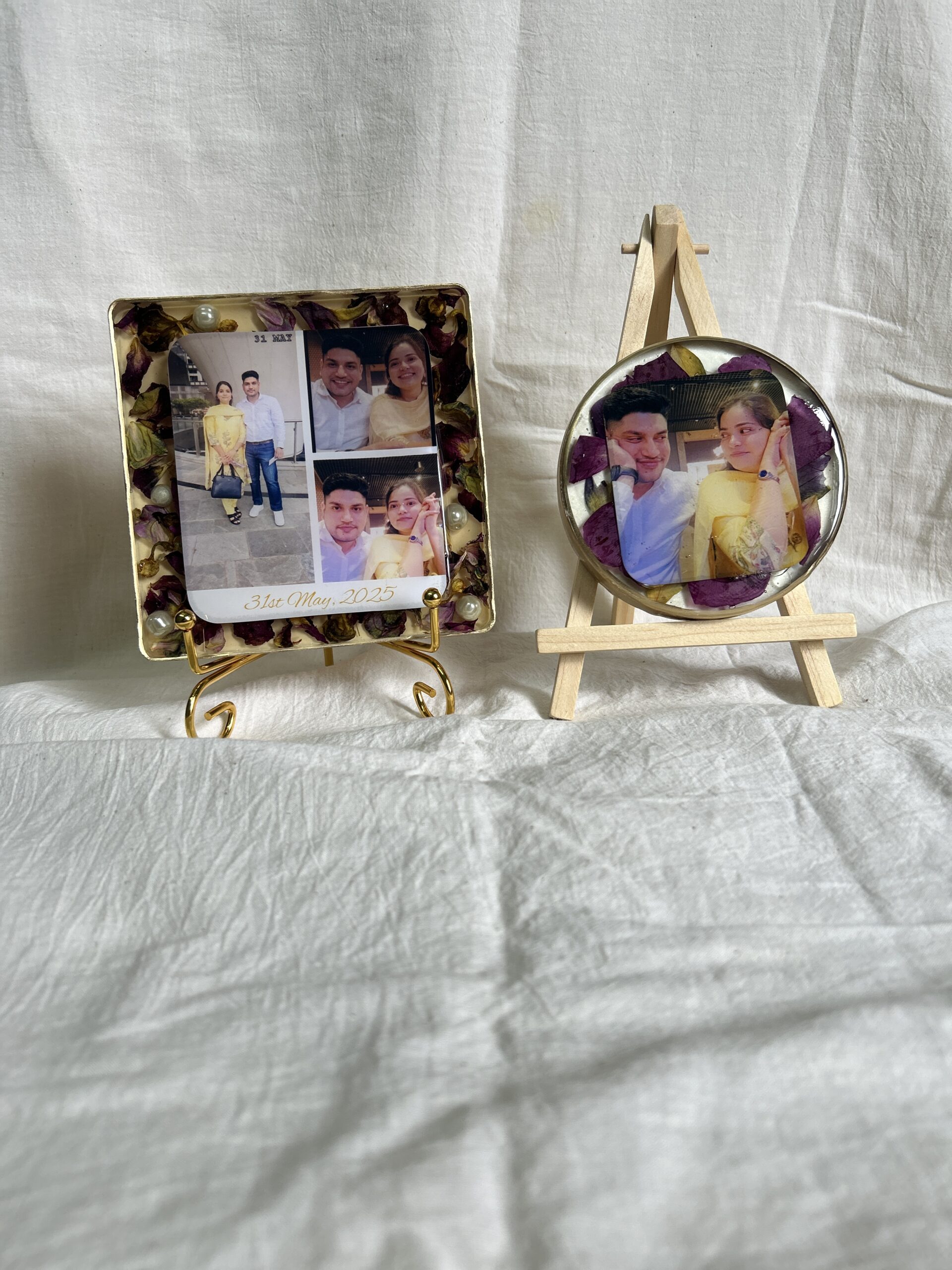 Real flowers from important occasions—such as varmala, bouquet flowers, or other sentimental blooms—are carefully dried and artistically preserved in resin. Each piece is handcrafted with attention to detail, ensuring your memories are captured gracefully while maintaining the natural beauty of the flowers.