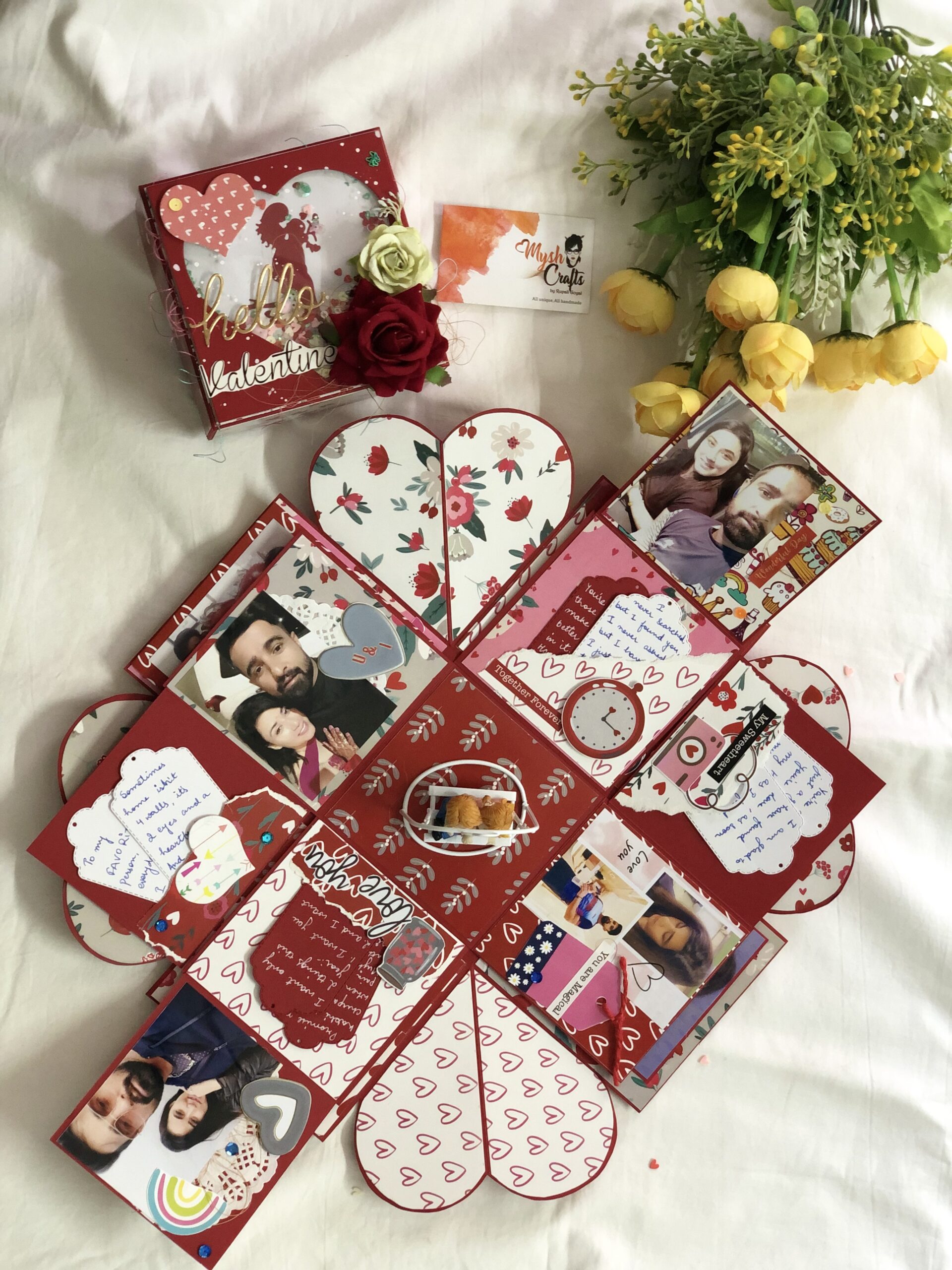 These custom love theme explosion boxes are thoughtfully handcrafted paper keepsakes designed to celebrate memories, emotions, and special moments. When opened, the box “explodes” into layered panels filled with photographs, handwritten notes, decorative elements, and heartfelt details.